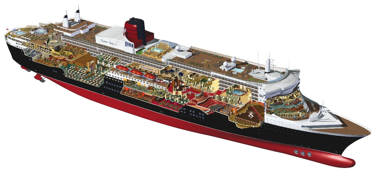Az RMS Queen Mary 2 2003-ban minden szempotból a világ legnagyobb oceánjárójának számított. Ma a 4. helyen áll a Royal Caribbean International Freedom Class hajói után. (bár valójában még mindig az 1 helyen áll, mert ez az egyetlen hajó ami csak óceánokat átszelö utakat tesz meg ) A QM2-n összesen 15 étterem, 5 úszómedence, színház, mozi,bálterem és planetárium áll az utasok rendelkezésére. Mivel nagyjából a fele utast tud szállítani, mint az Oasis of the Seas, méretben viszont nem sokkal kisebb, ezért a hajón több hely jut a szórakoztató programoknak, bároknak, éttermeknek és persze sétáló fedélzetnek.